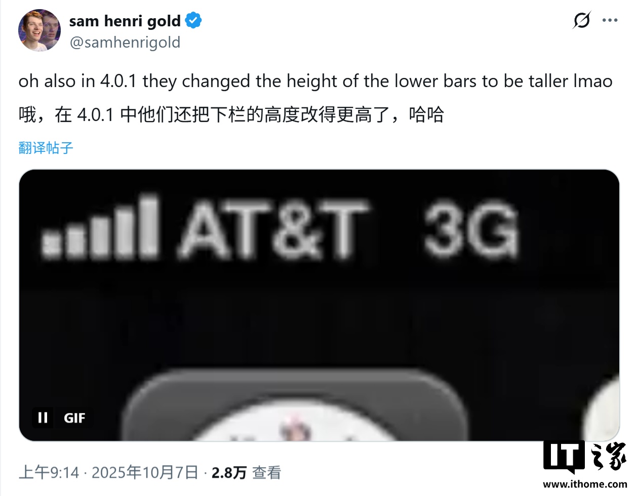 这一调整的结果是,用户虽然更难看到满格信号,但信号格也不会再出现断崖式下跌。戈尔德还发现一个有趣的细节:苹果在更新中还略微增加了前两格信号条的高度,这或许是一种心理学上的优化,从而让微弱信号看起来不那么糟糕。