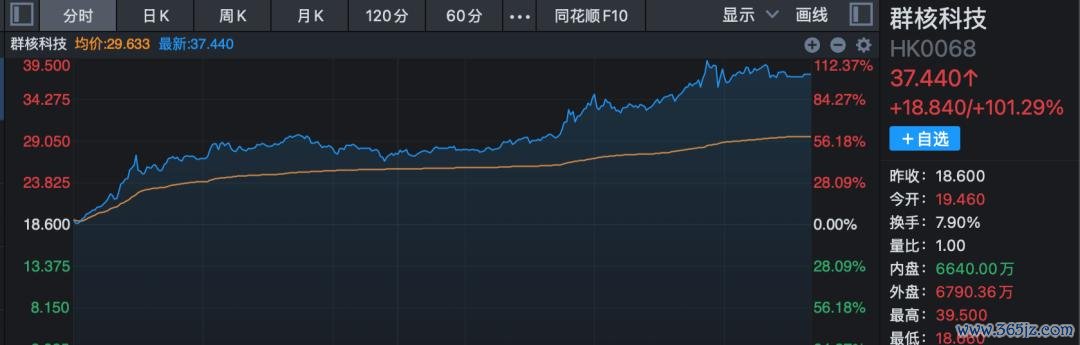 上周刚刚在港交所上市的群核科技今日放量大涨,截至收盘报收37.44港元/股,飙涨101.29%,全天成交39.8亿港元,换手率7.9%。