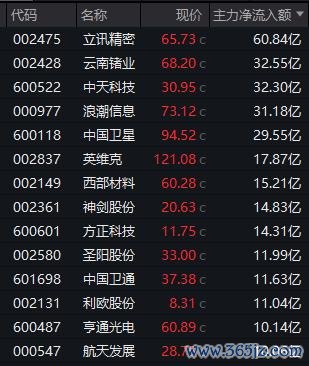 个股方面,立讯精密获得逾60亿元主力资金净流入,云南锗业、中天科技、浪潮信息获得超30亿元净流入,中国卫星获得逾29亿元净流入,英维克、西部材料等多股也都获得超10亿元净流入。