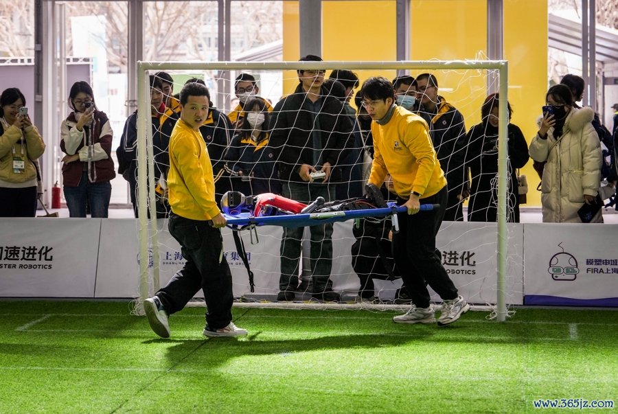 2025年2月21日,FIRA机器人足球比赛在上海举办。机器人选手被铲倒“受伤”,工作人员用担架将其抬下赛场。