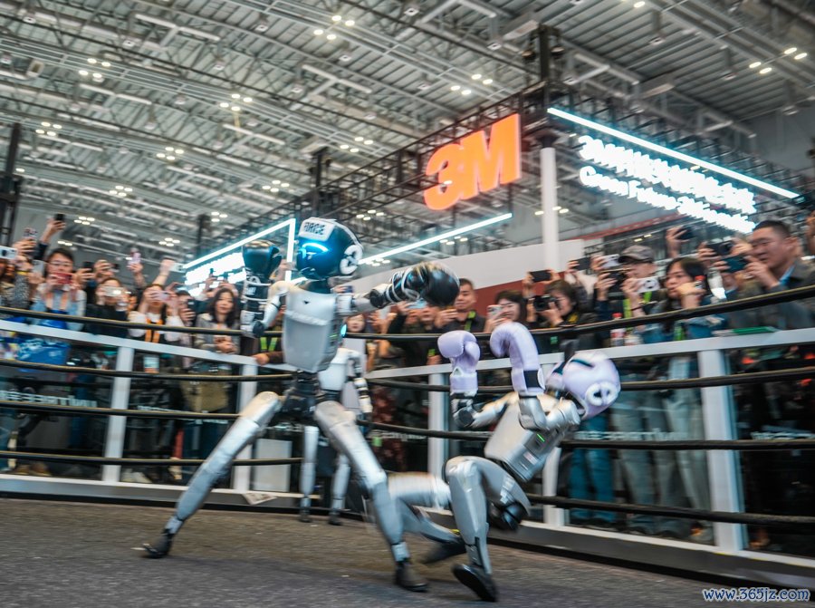 2025年11月6日,在第八届进博会人工智能展区,一台机器人在拳击比赛中用一记左直拳击倒了另一个机器人。