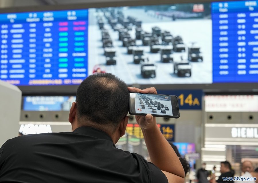 2025年9月3日,在虹桥火车站候车区,车站大屏直播中国人民抗日战争暨世界反法西斯战争胜利80周年阅兵式。旅客一边观看大屏幕,一边用手机收听解说。
